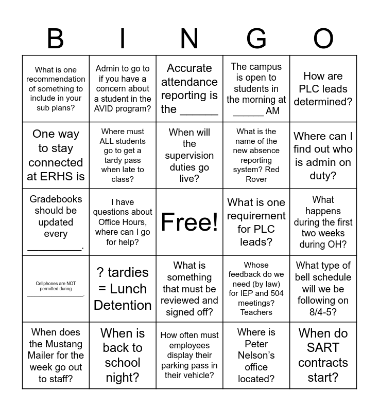 This bingo card has a free space and 24 words: ? tardies = Lunch Detention, When is back to school night?, When will the supervision duties go live?, When does the Mustang Mailer for the week go out to staff?, How are PLC leads determined?, What is one recommendation of something to include in your sub plans?, One way to stay connected at ERHS is, Admin to go to if you have a concern about a student in the AVID program?, What is one requirement for PLC leads?, What is something that must be reviewed and signed off?, What is the name of the new absence reporting system? Red Rover, Gradebooks should be updated every __________., Whose feedback do we need (by law) for IEP and 504 meetings? Teachers, What type of bell schedule will we be following on 8/4-5?, Where must ALL students go to get a tardy pass when late to class?, Where is Peter Nelson’s office located?, What happens during the first two weeks during OH?, Accurate attendance reporting is the ______, Where can I find out who is admin on duty?, I have questions about Office Hours, where can I go for help?, When do SART contracts start?, Cellphones are NOT permitted during _______________________., The campus is open to students in the morning at ______ AM and How often must employees display their parking pass in their vehicle?.