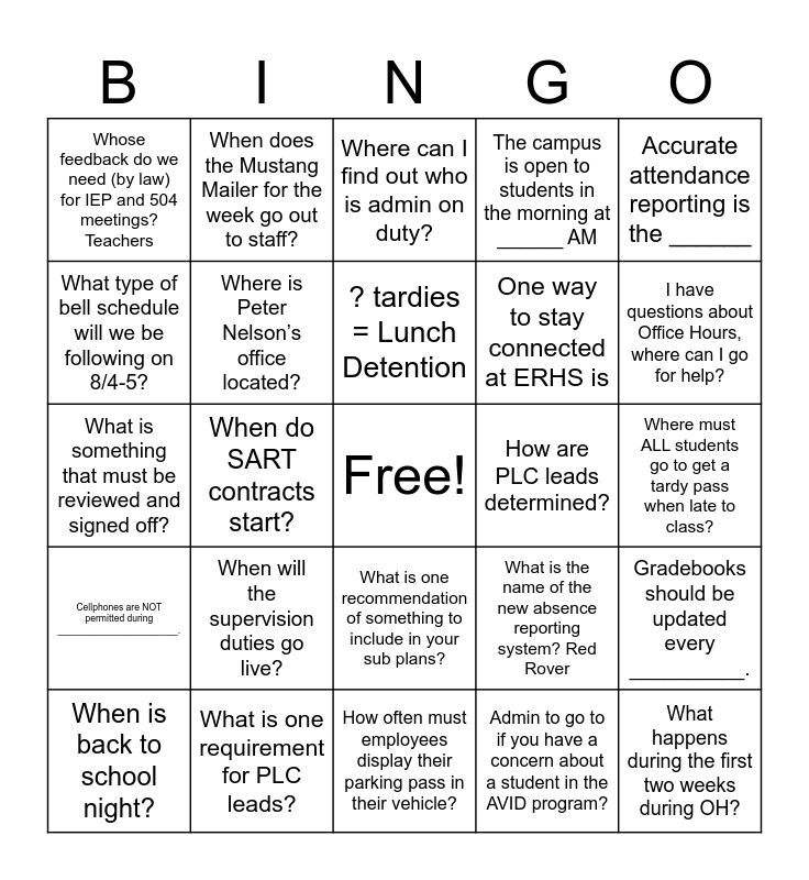 This bingo card has a free space and 24 words: When will the supervision duties go live?, What is one requirement for PLC leads?, ? tardies = Lunch Detention, When is back to school night?, Accurate attendance reporting is the ______, Whose feedback do we need (by law) for IEP and 504 meetings? Teachers, What type of bell schedule will we be following on 8/4-5?, When does the Mustang Mailer for the week go out to staff?, How are PLC leads determined?, What is one recommendation of something to include in your sub plans?, One way to stay connected at ERHS is, What is something that must be reviewed and signed off?, What is the name of the new absence reporting system? Red Rover, Gradebooks should be updated every __________., Where is Peter Nelson’s office located?, Admin to go to if you have a concern about a student in the AVID program?, Where must ALL students go to get a tardy pass when late to class?, Where can I find out who is admin on duty?, I have questions about Office Hours, where can I go for help?, When do SART contracts start?, What happens during the first two weeks during OH?, Cellphones are NOT permitted during _______________________., The campus is open to students in the morning at ______ AM and How often must employees display their parking pass in their vehicle?.