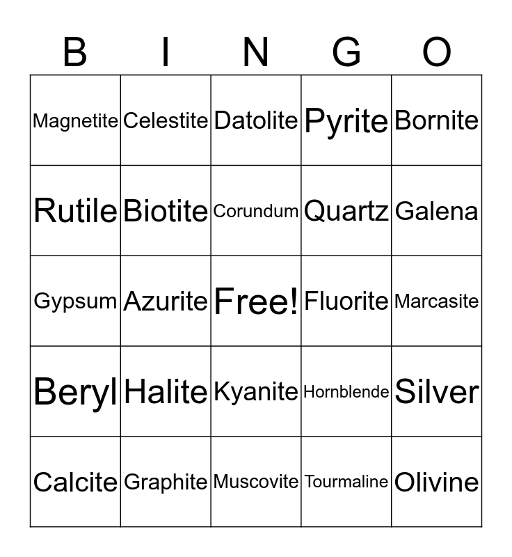 This bingo card has a free space and 33 words: Apatite, Aragonite, Azurite, Barite, Beryl, Biotite, Bornite, Calcite, Celestite, Copper, Corundum, Datolite, Diamond, Dolomite, Fluorite, Galena, Graphite, Gypsum, Halite, Hornblende, Kyanite, Labradorite, Magnetite, Marcasite, Muscovite, Olivine, Pyrite, Quartz, Rutile, Silver, Talc, Tourmaline and Zircon.
