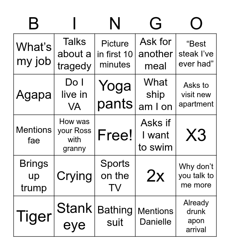 This bingo card has a free space and 24 words: Crying, Stank eye, Yoga pants, Tiger, “Best steak I’ve ever had”, What’s my job, Agapa, Talks about a tragedy, Asks if I want to swim, Sports on the TV, What ship am I on, Mentions fae, 2x, Why don’t you talk to me more, Do I live in VA, Mentions Danielle, X3, Picture in first 10 minutes, Asks to visit new apartment, How was your Ross with granny, Already drunk apon arrival, Brings up trump, Ask for another meal and Bathing suit.
