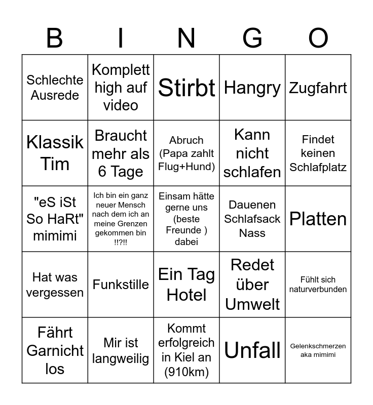 This bingo card has a free space and 24 words: Funkstille, Mir ist langweilig, Abruch (Papa zahlt Flug+Hund), Fährt Garnicht los, Zugfahrt, Schlechte Ausrede, Klassik Tim, Komplett high auf video, Dauenen Schlafsack Nass, Ein Tag Hotel, Kann nicht schlafen, "eS iSt So HaRt" mimimi, Redet über Umwelt, Fühlt sich naturverbunden, Braucht mehr als 6 Tage, Unfall, Platten, Stirbt, Findet keinen Schlafplatz, Ich bin ein ganz neuer Mensch nach dem ich an meine Grenzen gekommen bin !!?!!, Gelenkschmerzen aka mimimi, Hat was vergessen, Hangry and Kommt erfolgreich in Kiel an (910km).