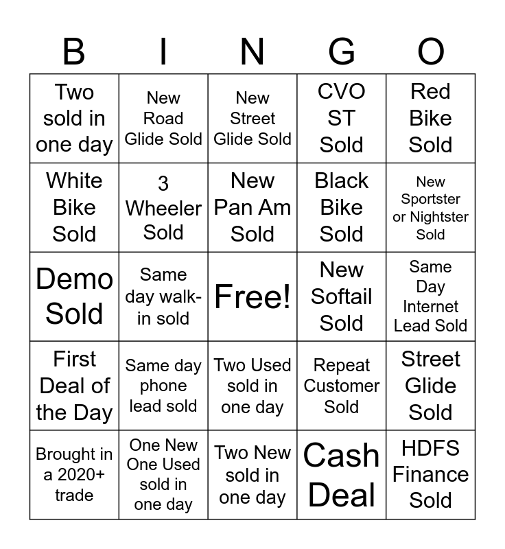 This bingo card has a free space and 24 words: Same day phone lead sold, One New One Used sold in one day, New Pan Am Sold, Brought in a 2020+ trade, Red Bike Sold, Two sold in one day, White Bike Sold, New Road Glide Sold, New Softail Sold, Two Used sold in one day, Black Bike Sold, Demo Sold, Repeat Customer Sold, Street Glide Sold, 3 Wheeler Sold, Cash Deal, Same Day Internet Lead Sold, New Street Glide Sold, New Sportster or Nightster Sold, Same day walk-in sold, HDFS Finance Sold, First Deal of the Day, CVO ST Sold and Two New sold in one day.