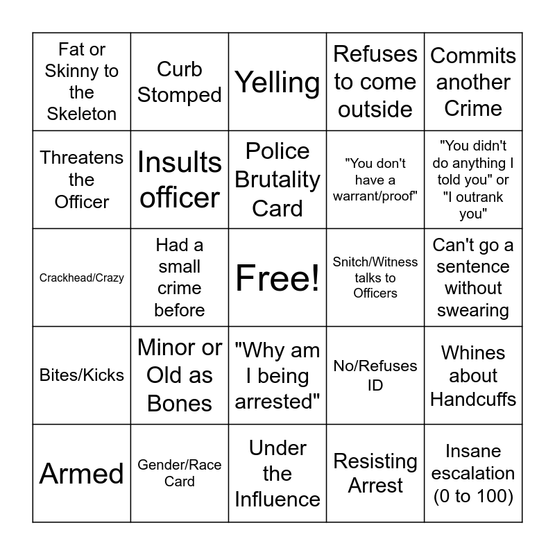 This bingo card has a free space and 24 words: Minor or Old as Bones, Gender/Race Card, Police Brutality Card, Armed, Commits another Crime, Fat or Skinny to the Skeleton, Threatens the Officer, Curb Stomped, Snitch/Witness talks to Officers, "Why am I being arrested", "You don't have a warrant/proof", Crackhead/Crazy, No/Refuses ID, Whines about Handcuffs, Insults officer, Resisting Arrest, Can't go a sentence without swearing, Yelling, "You didn't do anything I told you" or "I outrank you", Had a small crime before, Insane escalation (0 to 100), Bites/Kicks, Refuses to come outside and Under the Influence.