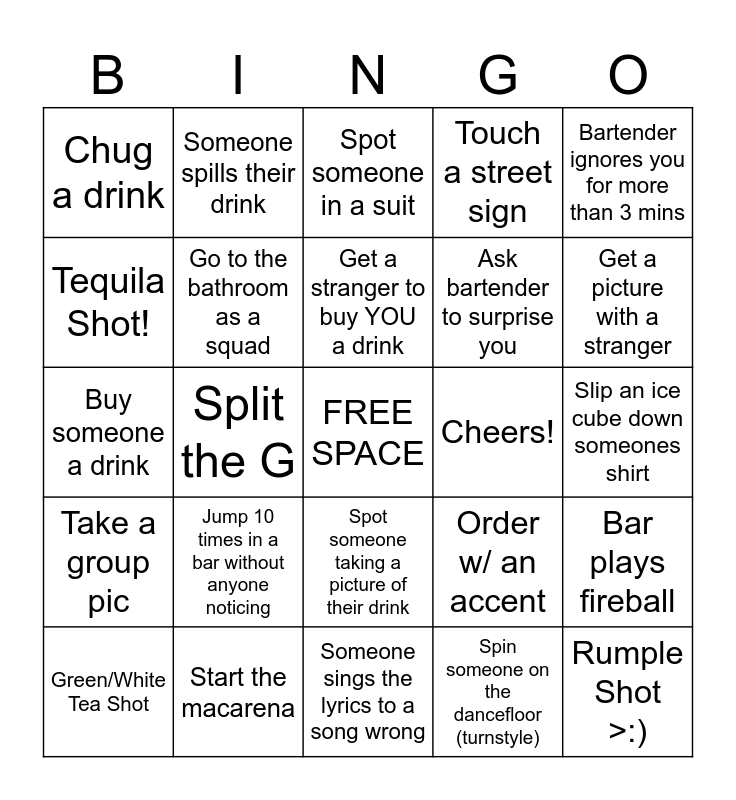This bingo card has a free space and 24 words: Jump 10 times in a bar without anyone noticing, Start the macarena, Get a stranger to buy YOU a drink, Green/White Tea Shot, Bartender ignores you for more than 3 mins, Chug a drink, Tequila Shot!, Someone spills their drink, Cheers!, Spot someone taking a picture of their drink, Ask bartender to surprise you, Buy someone a drink, Order w/ an accent, Bar plays fireball, Go to the bathroom as a squad, Spin someone on the dancefloor (turnstyle), Slip an ice cube down someones shirt, Spot someone in a suit, Get a picture with a stranger, Split the G, Rumple Shot >:), Take a group pic, Touch a street sign and Someone sings the lyrics to a song wrong.