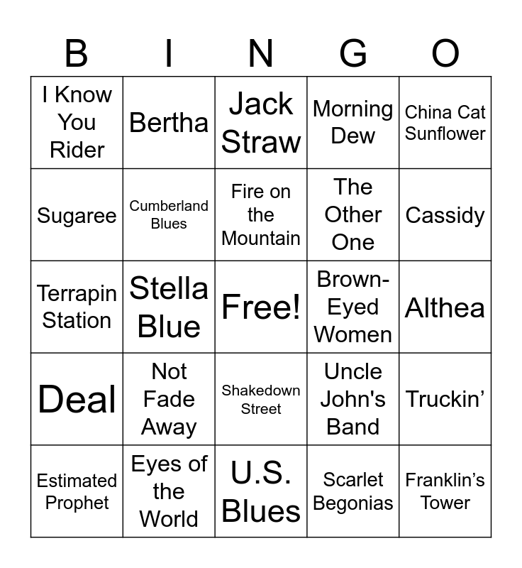 This bingo card has a free space and 26 words: Shakedown Street, Scarlet Begonias, Fire on the Mountain, Eyes of the World, China Cat Sunflower, I Know You Rider, Sugaree, Bertha, Althea, Uncle John's Band, The Other One, Terrapin Station, Truckin’, Estimated Prophet, Stella Blue, He’s Gone, Morning Dew, Deal, Jack Straw, Franklin’s Tower, Cassidy, U.S. Blues, Brown-Eyed Women, Not Fade Away, Cumberland Blues and Tennessee Jed.