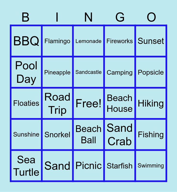 This bingo card has a free space and 34 words: Flip Flops, Starfish, Watermelon, Bumble Bee, Sunshine, Pineapple, Sunset, Sea Turtle, Flamingo, Ice Cream, Sandcastle, Lemonade, Sunglasses, Beach Umbrella, Beach House, Popsicle, Sand, Floaties, Snorkel, Sand Crab, Beach Ball, Beach, BBQ, Hiking, Picnic, Swimming, Fireworks, Bikeride, Camping, Pool Day, Gardening, Road Trip, Fishing and Festival.