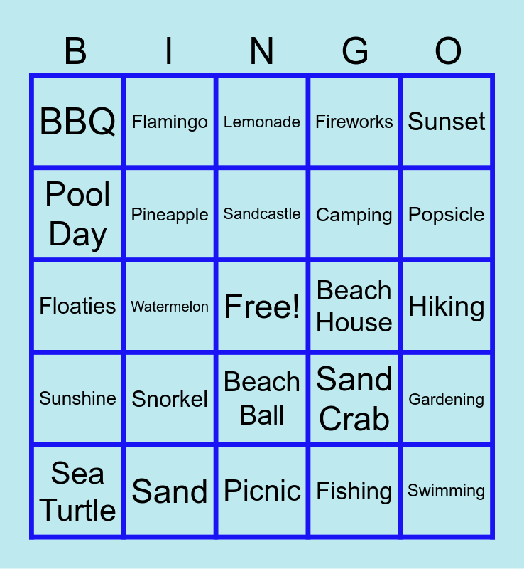 This bingo card has a free space and 33 words: Flip Flops, Starfish, Watermelon, Bumble Bee, Sunshine, Pineapple, Sunset, Sea Turtle, Flamingo, Ice Cream, Sandcastle, Lemonade, Sunglasses, Beach Umbrella, Beach House, Popsicle, Sand, Floaties, Snorkel, Sand Crab, Beach Ball, Beach, BBQ, Hiking, Picnic, Swimming, Fireworks, Camping, Pool Day, Gardening, Road Trip, Fishing and Festival.