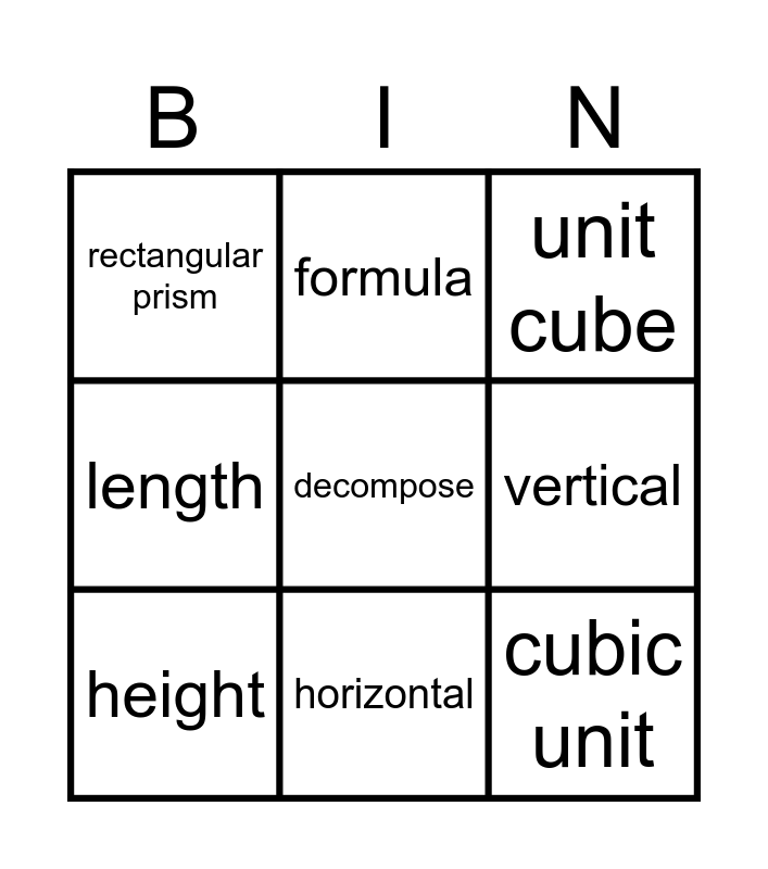 This bingo card has a free space and 17 words: area, volume, unit cube, rectangular prism, cube, length, width, height, horizontal, vertical, diagonal, base, cubic unit, formula, sum, free space and fraction.