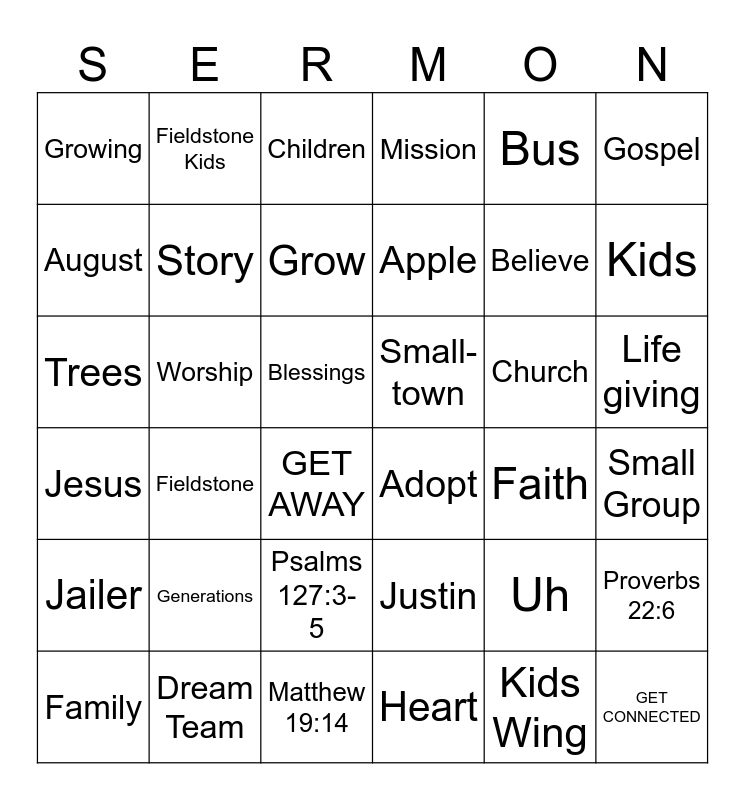 This bingo card has 37 words: Uh, Justin, Kids Wing, August, Fieldstone, Church, Story, Heart, Bus, Family, Kids, Mission, Trees, Blessings, Gospel, Small-town, Generations, Children, Life giving, Worship, Growing, Apple, GET AWAY, Faith, Dream Team, Small Group, Fieldstone Kids, Matthew 19:14, Proverbs 22:6, Psalms 127:3-5, Ephesians 1:5, Adopt, Believe, Jailer, Jesus, Grow and GET CONNECTED.