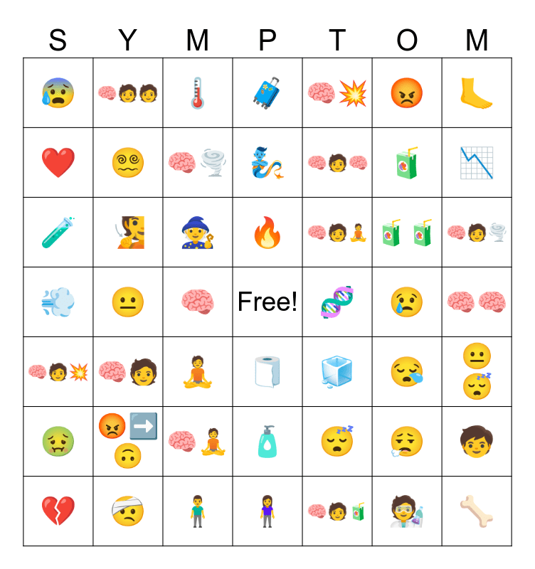 This bingo card has a free space and 48 words: ๐ด, ๐ง, ๐งโโ๏ธ, ๐, ๐ง, ๐ง โ๐ง , ๐ง โ๐งโ๐ง, ๐ค, ๐ก, ๐งป, ๐ฆถ, ๐งณ, ๐งโ๐ง, ๐ง โ๐งโ๐ง, ๐คข, ๐ข, โค๏ธ, ๐, ๐ฎโ๐จ, ๐ง โ๐ฅ, ๐ง โ๐งโ๐ง , ๐ง , ๐ฐ, ๐ตโ๐ซ, ๐ง, ๐ง โ๐ช๏ธ, ๐ง โ๐งโ๐ช๏ธ, ๐, ๐ฅ, ๐ง, ๐งโ๐ฌ, ๐งฌ, ๐๐ด, ๐กโก๏ธ๐, ๐จ, ๐ง, ๐ช, ๐งช, ๐ง, ๐ง โ๐ง, ๐ง โ๐งโ๐ฅ, ๐ฆด, ๐ก๏ธ, ๐งโโ๏ธ, ๐ง, ๐งด, ๐ง โ๐ง and ๐ง โ๐งโ๐ง.