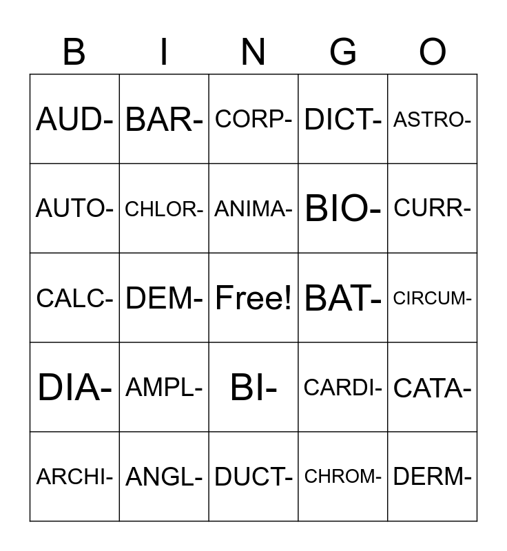 This bingo card has a free space and 24 words: AMPL-, ANGL-, ANIMA-, ARCHI-, ASTRO-, AUD-, AUTO-, BAR-, BAT-, BI-, BIO-, CALC-, CARDI-, CATA-, CHLOR-, CHROM-, CIRCUM-, CORP-, CURR-, DEM-, DERM-, DIA-, DICT- and DUCT-.