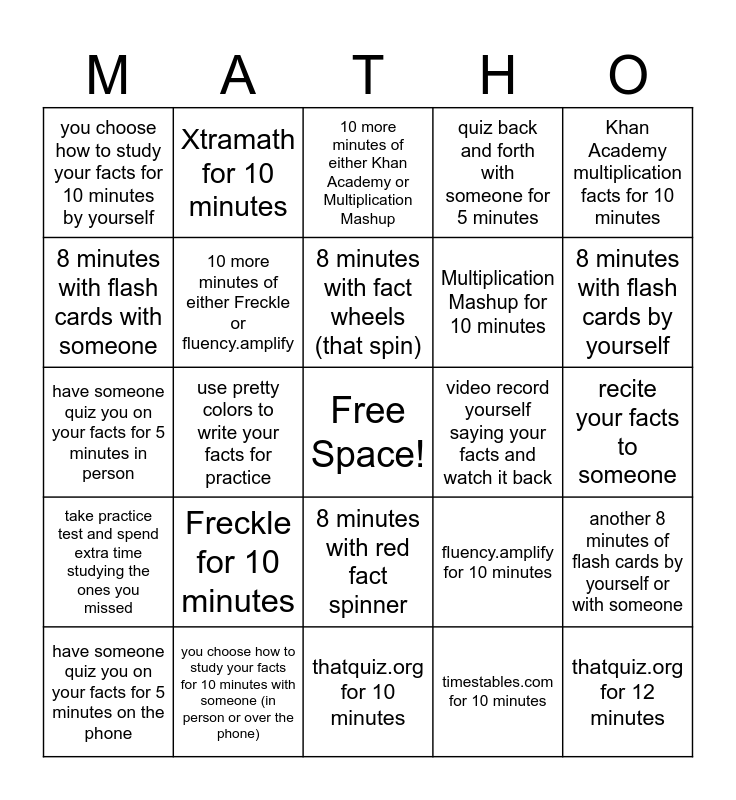 This bingo card has a free space and 24 words: Freckle for 10 minutes, you choose how to study your facts for 10 minutes with someone (in person or over the phone), 8 minutes with fact wheels (that spin), have someone quiz you on your facts for 5 minutes on the phone, Khan Academy multiplication facts for 10 minutes, you choose how to study your facts for 10 minutes by yourself, 8 minutes with flash cards with someone, Xtramath for 10 minutes, video record yourself saying your facts and watch it back, 8 minutes with red fact spinner, Multiplication Mashup for 10 minutes, have someone quiz you on your facts for 5 minutes in person, fluency.amplify for 10 minutes, another 8 minutes of flash cards by yourself or with someone, 10 more minutes of either Freckle or fluency.amplify, timestables.com for 10 minutes, recite your facts to someone, 10 more minutes of either Khan Academy or Multiplication Mashup, 8 minutes with flash cards by yourself, use pretty colors to write your facts for practice, thatquiz.org for 12 minutes, take practice test and spend extra time studying the ones you missed, quiz back and forth with someone for 5 minutes and thatquiz.org for 10 minutes.
