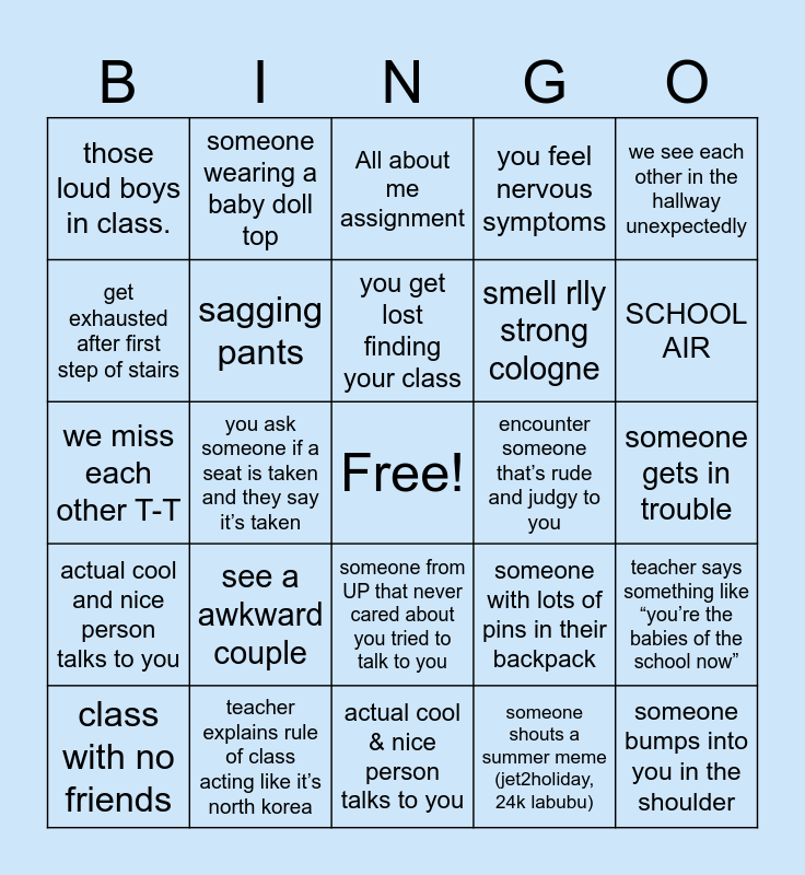 This bingo card has a free space and 24 words: class with no friends, see a awkward couple, you get lost finding your class, someone shouts a summer meme (jet2holiday, 24k labubu), we see each other in the hallway unexpectedly, those loud boys in class., someone wearing a baby doll top, All about me assignment, encounter someone that’s rude and judgy to you, someone gets in trouble, we miss each other T-T, sagging pants, someone with lots of pins in their backpack, teacher says something like “you’re the babies of the school now”, get exhausted after first step of stairs, teacher explains rule of class acting like it’s north korea, actual cool & nice person talks to you, you feel nervous symptoms, SCHOOL AIR, actual cool and nice person talks to you, you ask someone if a seat is taken and they say it’s taken, someone from UP that never cared about you tried to talk to you, smell rlly strong cologne and someone bumps into you in the shoulder.