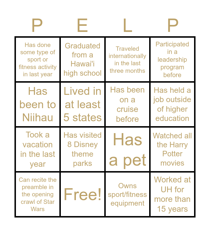 This bingo card has 22 words: Free!, Was born in same month as you, Graduated from a Hawai'i high school, Earned a degree (or multiple degrees) from UH, Lived in at least 5 states, Has been on a cruise before, Has done some type of sport or fitness activity in last year, Traveled internationally in the last three months, Has a pet, Worked at UH for more than 15 years, Took a vacation in the last year, Participated in a leadership program before, Participated in community service in the last 3 years, Owns an electric/hybrid vehicle, Owns sport/fitness equipment, Read all three books of Fifty Shades of Grey, Watched all the Harry Potter movies, Can recite the preamble in the opening crawl of Star Wars, Has visited 8 Disney theme parks, Has been to Niihau, Has held a job outside of higher education and Is in PELP because a former PELPer recommended it.