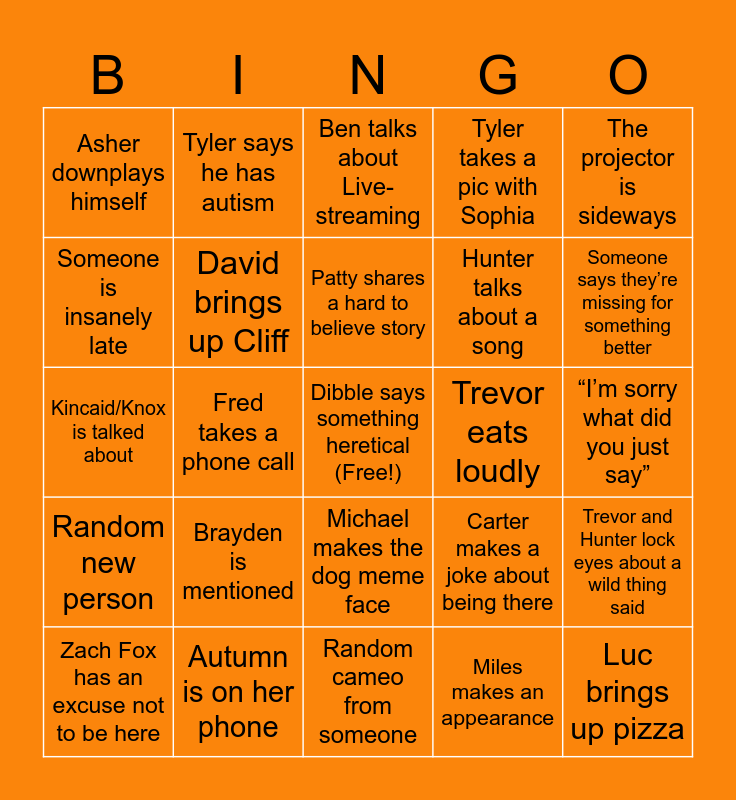 This bingo card has a free space and 24 words: Brayden is mentioned, Autumn is on her phone, Patty shares a hard to believe story, Zach Fox has an excuse not to be here, The projector is sideways, Asher downplays himself, Someone is insanely late, Tyler says he has autism, Trevor eats loudly, Michael makes the dog meme face, Hunter talks about a song, Kincaid/Knox is talked about, Carter makes a joke about being there, Trevor and Hunter lock eyes about a wild thing said, David brings up Cliff, Miles makes an appearance, “I’m sorry what did you just say”, Ben talks about Live-streaming, Someone says they’re missing for something better, Fred takes a phone call, Luc brings up pizza, Random new person, Tyler takes a pic with Sophia and Random cameo from someone.