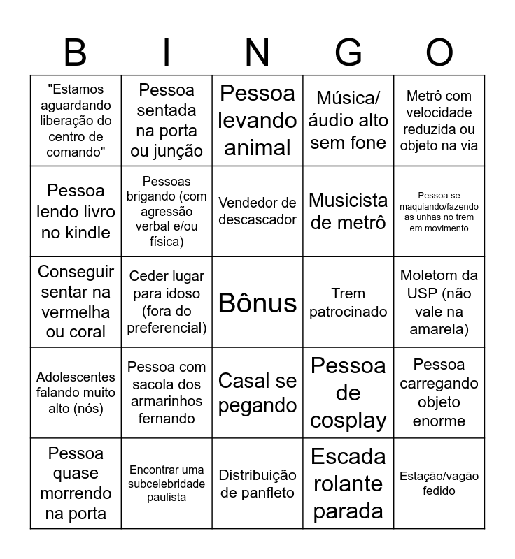 This bingo card has a free space and 24 words: Pessoa com sacola dos armarinhos fernando, Encontrar uma subcelebridade paulista, Vendedor de descascador, Pessoa quase morrendo na porta, Metrô com velocidade reduzida ou objeto na via, "Estamos aguardando liberação do centro de comando", Pessoa lendo livro no kindle, Pessoa sentada na porta ou junção, Trem patrocinado, Casal se pegando, Musicista de metrô, Conseguir sentar na vermelha ou coral, Pessoa de cosplay, Pessoa carregando objeto enorme, Pessoas brigando (com agressão verbal e/ou física), Escada rolante parada, Moletom da USP (não vale na amarela), Pessoa levando animal, Pessoa se maquiando/fazendo as unhas no trem em movimento, Ceder lugar para idoso (fora do preferencial), Estação/vagão fedido, Adolescentes falando muito alto (nós), Música/áudio alto sem fone and Distribuição de panfleto.
