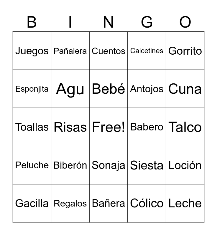 This bingo card has a free space and 29 words: Gacilla, Muñeca, Risas, Gatear, Juegos, Cuentos, Agu, Biberón, Babero, Regalos, Talco, Leche, Bañera, Cólico, Cuna, Juguetes, Sonaja, Peluche, Gorrito, Toallas, Siesta, Botitas, Antojos, Esponjita, Calcetines, Pañalera, Loción, Bebé and Cigüeña.