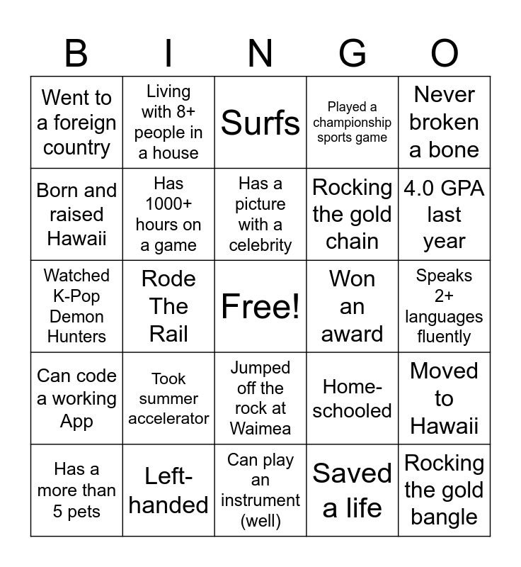 This bingo card has a free space and 24 words: Has a more than 5 pets, Took summer accelerator, Has a picture with a celebrity, Saved a life, Never broken a bone, Went to a foreign country, Living with 8+ people in a house, Surfs, Won an award, Speaks 2+ languages fluently, Watched K-Pop Demon Hunters, Has 1000+ hours on a game, Home-schooled, Moved to Hawaii, Born and raised Hawaii, Left-handed, Can play an instrument (well), Played a championship sports game, 4.0 GPA last year, Can code a working App, Rode The Rail, Jumped off the rock at Waimea, Rocking the gold chain and Rocking the gold bangle.
