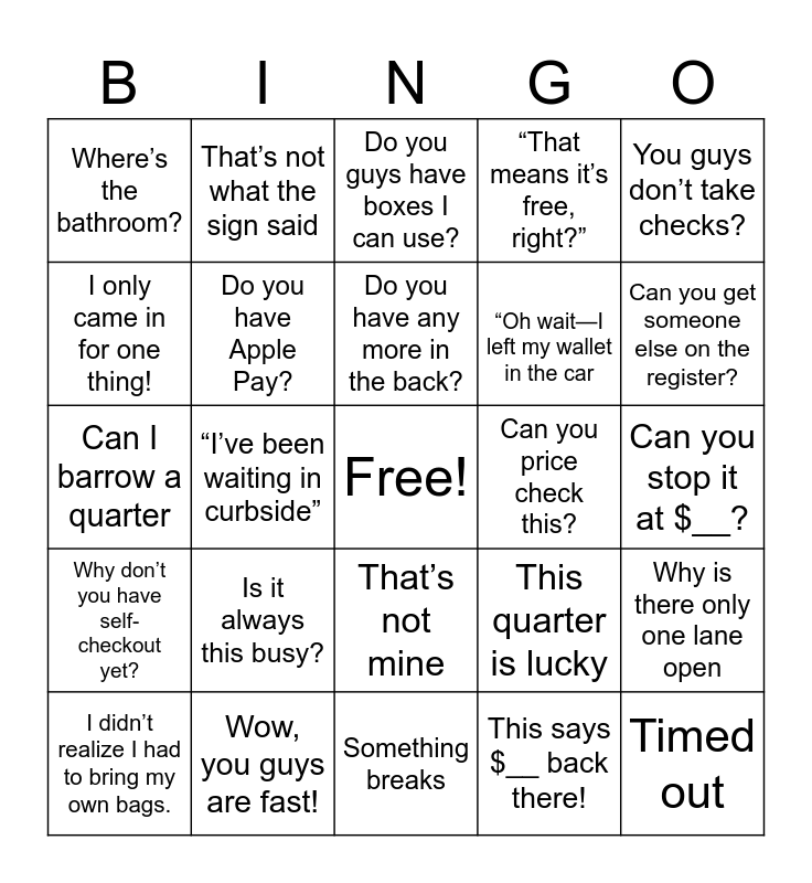 This bingo card has a free space and 24 words: Is it always this busy?, Wow, you guys are fast!, Do you have any more in the back?, I didn’t realize I had to bring my own bags., You guys don’t take checks?, Where’s the bathroom?, I only came in for one thing!, That’s not what the sign said, Can you price check this?, That’s not mine, “Oh wait—I left my wallet in the car, Can I barrow a quarter, This quarter is lucky, Why is there only one lane open, Do you have Apple Pay?, This says $__ back there!, Can you stop it at $__?, Do you guys have boxes I can use?, Can you get someone else on the register?, “I’ve been waiting in curbside”, Timed out, Why don’t you have self-checkout yet?, “That means it’s free, right?” and Something breaks.
