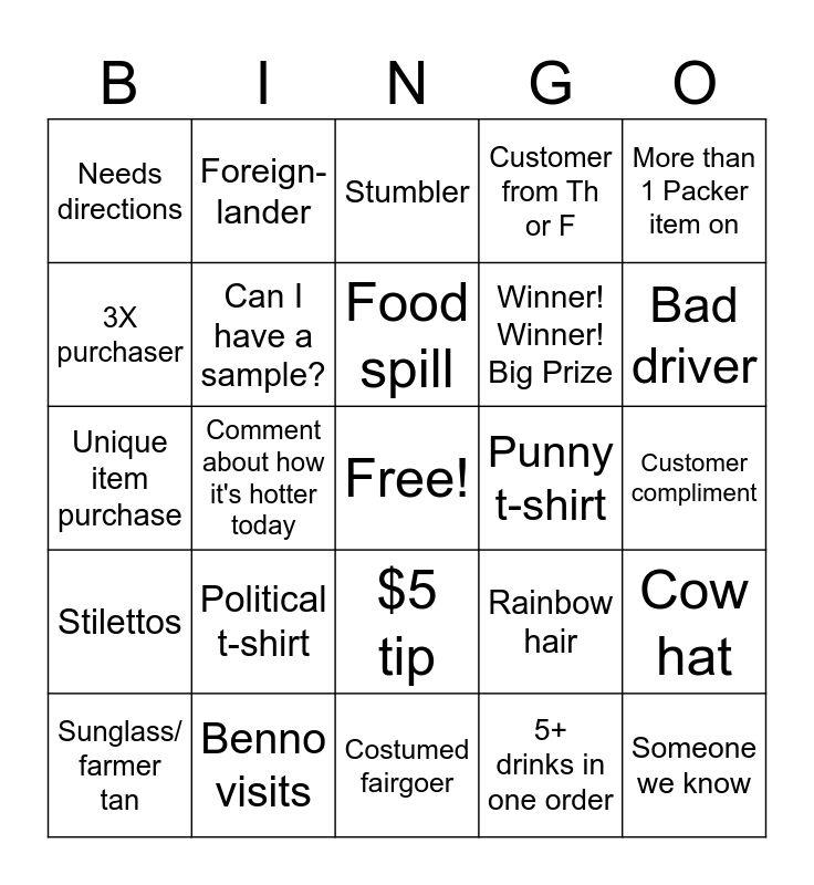 This bingo card has a free space and 24 words: Political t-shirt, Benno visits, Food spill, Sunglass/ farmer tan, More than 1 Packer item on, Needs directions, 3X purchaser, Foreign-lander, Punny t-shirt, $5 tip, Winner! Winner! Big Prize, Unique item purchase, Rainbow hair, Cow hat, Can I have a sample?, 5+ drinks in one order, Customer compliment, Stumbler, Bad driver, Comment about how it's hotter today, Someone we know, Stilettos, Customer from Th or F and Costumed fairgoer.