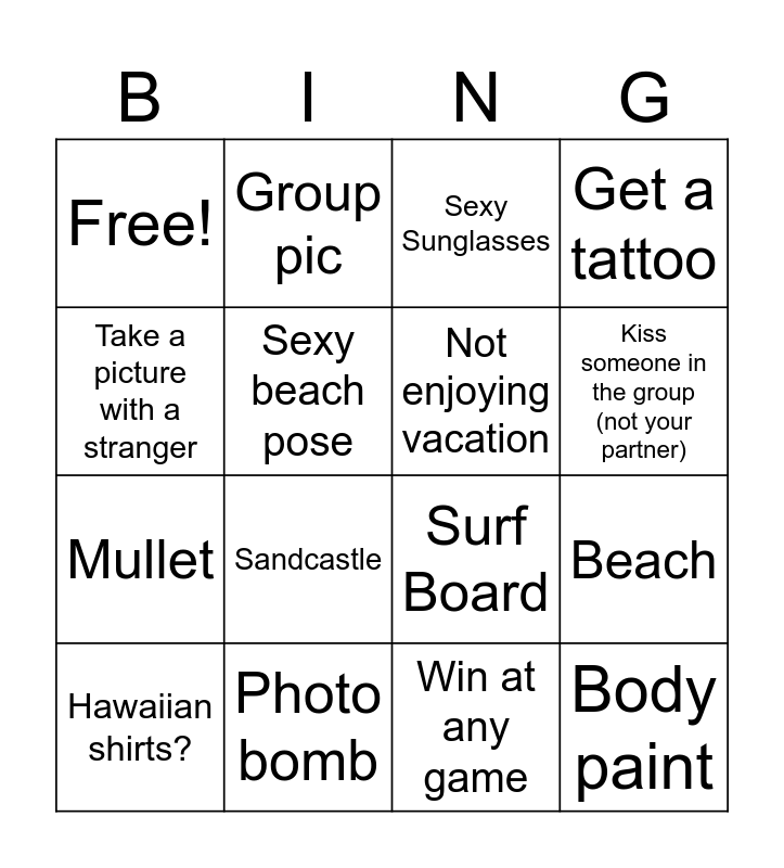 This bingo card has 16 words: Hawaiian shirts?, Photo bomb, Sexy Sunglasses, Get a tattoo, Take a picture with a stranger, Group pic, Surf Board, Beach, Free!, Sexy beach pose, Win at any game, Kiss someone in the group (not your partner), Mullet, Sandcastle, Not enjoying vacation and Body paint.
