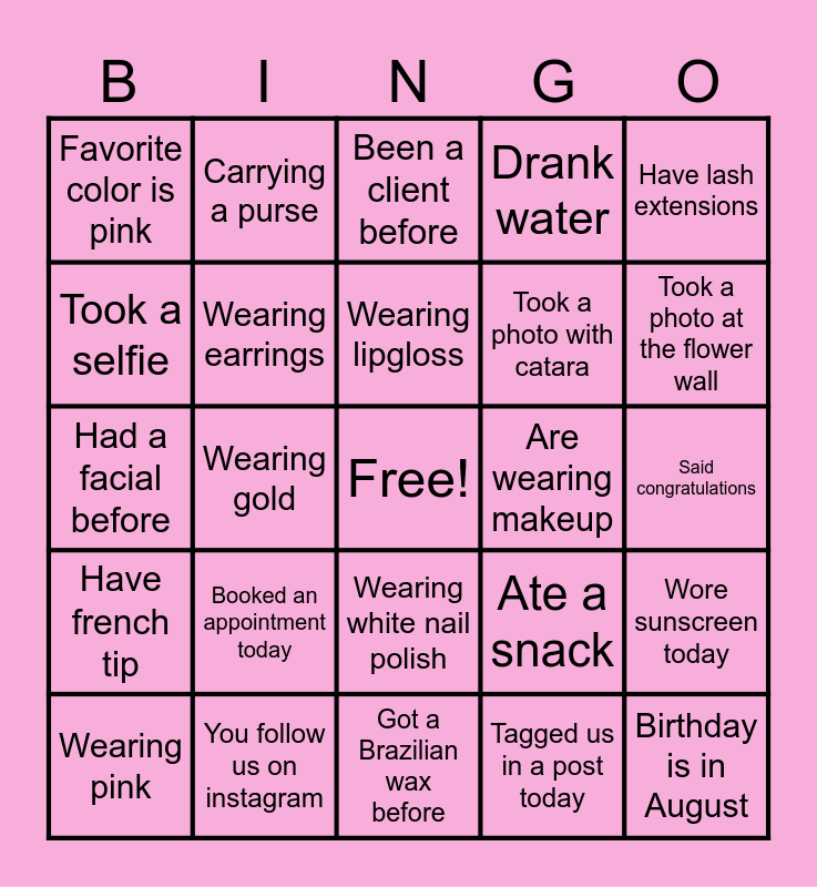 This bingo card has a free space and 24 words: Booked an appointment today, You follow us on instagram, Wearing lipgloss, Wearing pink, Have lash extensions, Favorite color is pink, Took a selfie, Carrying a purse, Are wearing makeup, Wearing white nail polish, Took a photo with catara, Had a facial before, Ate a snack, Wore sunscreen today, Wearing earrings, Tagged us in a post today, Said congratulations, Been a client before, Took a photo at the flower wall, Wearing gold, Birthday is in August, Have french tip, Drank water and Got a Brazilian wax before.