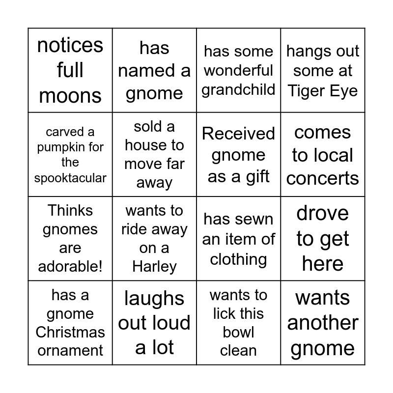 This bingo card has 28 words: Made a Gnome, can name three local lighthouses, Thinks gnomes are adorable!, Traveled to a warm place for winter, sold a house to move far away, has some wonderful grandchild, has named a gnome, wants another gnome, laughs out loud a lot, shares fun stories, has sewn an item of clothing, hangs out some at Tiger Eye, likes pistachio ice cream, eats wet nuts, wants to ride away on a Harley, lives in Warwick, watched a sunset over the water, Received gnome as a gift, comes to local concerts, steps up to help a friend in need, notices full moons, ever read a book with/about gnomes, has a gnome Christmas ornament, drove to get here, wants to lick this bowl clean, has a gnome printed on something, carved a pumpkin for the spooktacular and owns a gnome magnet.