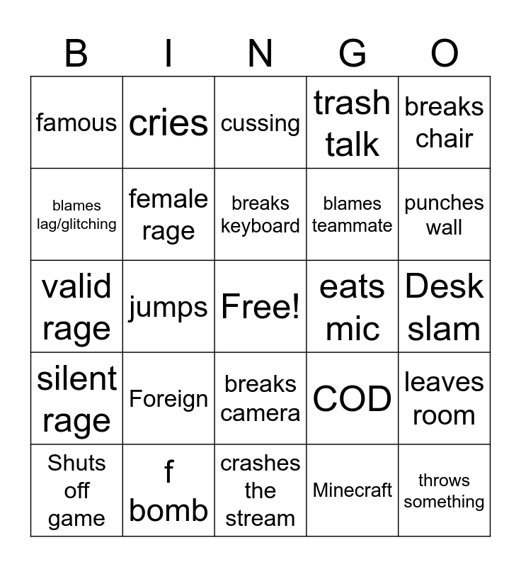 This bingo card has a free space and 24 words: Foreign, f bomb, breaks keyboard, Shuts off game, breaks chair, famous, blames lag/glitching, cries, eats mic, breaks camera, blames teammate, valid rage, COD, leaves room, female rage, Minecraft, Desk slam, cussing, punches wall, jumps, throws something, silent rage, trash talk and crashes the stream.