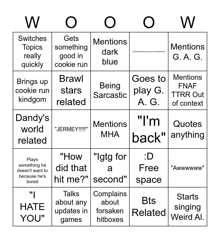 This bingo card has 25 words: "How did that hit me?", Complains about forsaken hitboxes, Being Sarcastic, "I HATE YOU", Mentions G. A. G., Switches Topics really quickly, Brings up cookie run kindgom, Gets something good in cookie run, "I'm back", "Igtg for a second", Goes to play G. A. G., Dandy's world related, :D Free space, "Awwwwww", Brawl stars related, Starts singing Weird Al., Quotes anything, Mentions dark blue, Mentions FNAF TTRR Out of context, "JERMEY!!!!!", Mentions MHA, Talks about any updates in games, Plays something he doesn't want to because he's bored, "WWWWWWWOOOOOOOWWWWWW" and Bts Related.