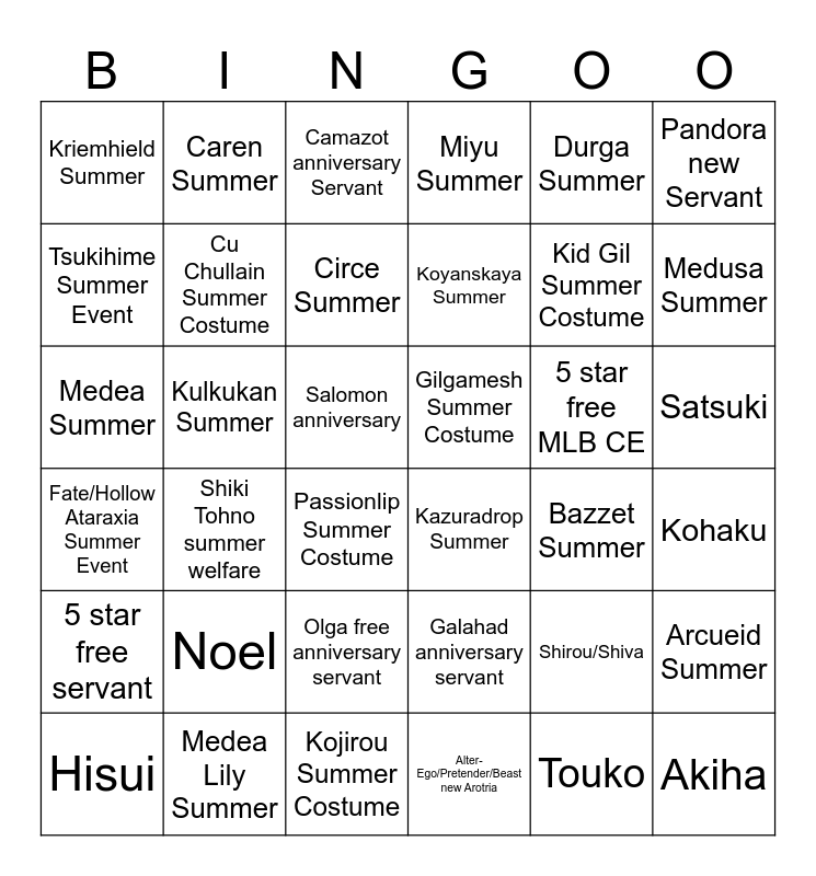 This bingo card has 36 words: Galahad anniversary servant, Olga free anniversary servant, Alter-Ego/Pretender/Beast new Arotria, Tsukihime Summer Event, Fate/Hollow Ataraxia Summer Event, Gilgamesh Summer Costume, Cu Chullain Summer Costume, Kojirou Summer Costume, Durga Summer, Shirou/Shiva, Medusa Summer, Miyu Summer, Arcueid Summer, Kulkukan Summer, Koyanskaya Summer, Kriemhield Summer, 5 star free servant, 5 star free MLB CE, Medea Summer, Camazot anniversary Servant, Salomon anniversary, Shiki Tohno summer welfare, Kazuradrop Summer, Passionlip Summer Costume, Bazzet Summer, Caren Summer, Kid Gil Summer Costume, Medea Lily Summer, Circe Summer, Pandora new Servant, Akiha, Hisui, Kohaku, Satsuki, Noel and Touko.