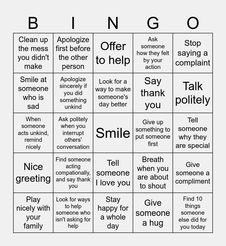 This bingo card has a free space and 24 words: Find someone acting compationally, and say thank you, Look for ways to help someone who isn't asking for help, Look for a way to make someone's day better, Play nicely with your family, Stop saying a complaint, Clean up the mess you didn't make, Smile at someone who is sad, Apologize first before the other person, Give up something to put someone first, Tell someone I love you, Say thank you, When someone acts unkind, remind nicely, Breath when you are about to shout, Give someone a compliment, Apologize sincerely if you did something unkind, Give someone a hug, Tell someone why they are special, Offer to help, Talk politely, Ask politely when you interrupt others' conversation, Find 10 things someone else did for you today, Nice greeting, Ask someone how they felt by your action and Stay happy for a whole day.