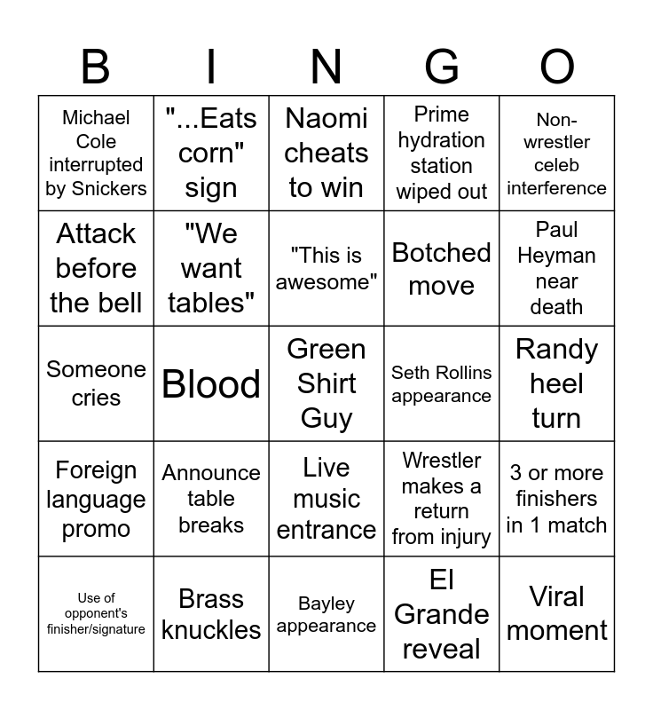 This bingo card has a free space and 24 words: Announce table breaks, Brass knuckles, "This is awesome", Use of opponent's finisher/signature, Non-wrestler celeb interference, Michael Cole interrupted by Snickers, Attack before the bell, "...Eats corn" sign, Seth Rollins appearance, Live music entrance, Botched move, Someone cries, Wrestler makes a return from injury, 3 or more finishers in 1 match, "We want tables", El Grande reveal, Randy heel turn, Naomi cheats to win, Paul Heyman near death, Blood, Viral moment, Foreign language promo, Prime hydration station wiped out and Bayley appearance.