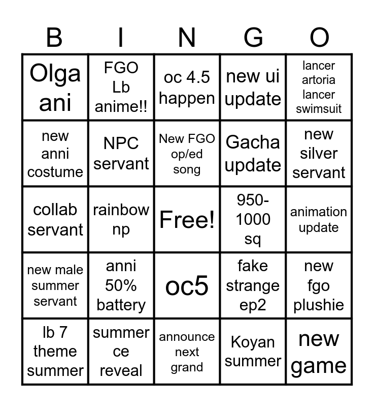 This bingo card has a free space and 24 words: anni 50% battery, summer ce reveal, New FGO op/ed song, lb 7 theme summer, lancer artoria lancer swimsuit, Olga ani, new anni costume, FGO Lb anime!!, 950-1000 sq, oc5, Gacha update, collab servant, fake strange ep2, new fgo plushie, NPC servant, Koyan summer, animation update, oc 4.5 happen, new silver servant, rainbow np, new game, new male summer servant, new ui update and announce next grand.