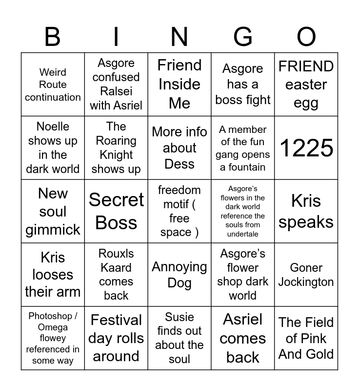 This bingo card has a free space and 24 words: Photoshop / Omega flowey referenced in some way, Rouxls Kaard comes back, More info about Dess, Asriel comes back, FRIEND easter egg, Weird Route continuation, Asgore confused Ralsei with Asriel, Friend Inside Me, Asgore’s flowers in the dark world reference the souls from undertale, Kris speaks, New soul gimmick, The Roaring Knight shows up, Asgore’s flower shop dark world, Goner Jockington, Noelle shows up in the dark world, Festival day rolls around, Susie finds out about the soul, Asgore has a boss fight, 1225, Kris looses their arm, Secret Boss, Annoying Dog, A member of the fun gang opens a fountain and The Field of Pink And Gold.