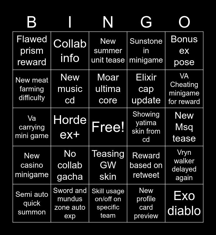 This bingo card has a free space and 24 words: No collab gacha, Sword and mundus zone auto exp, Moar ultima core, Semi auto quick summon, Bonus ex pose, Flawed prism reward, New meat farming difficulty, Collab info, Showing yatima skin from cd, Teasing GW skin, Elixir cap update, Va carrying mini game, Reward based on retweet, Vryn walker delayed again, New music cd, New profile card preview, New Msq tease, New summer unit tease, VA Cheating minigame for reward, Horde ex+, Exo diablo, New casino minigame, Sunstone in minigame and Skill usage on/off on specific team.