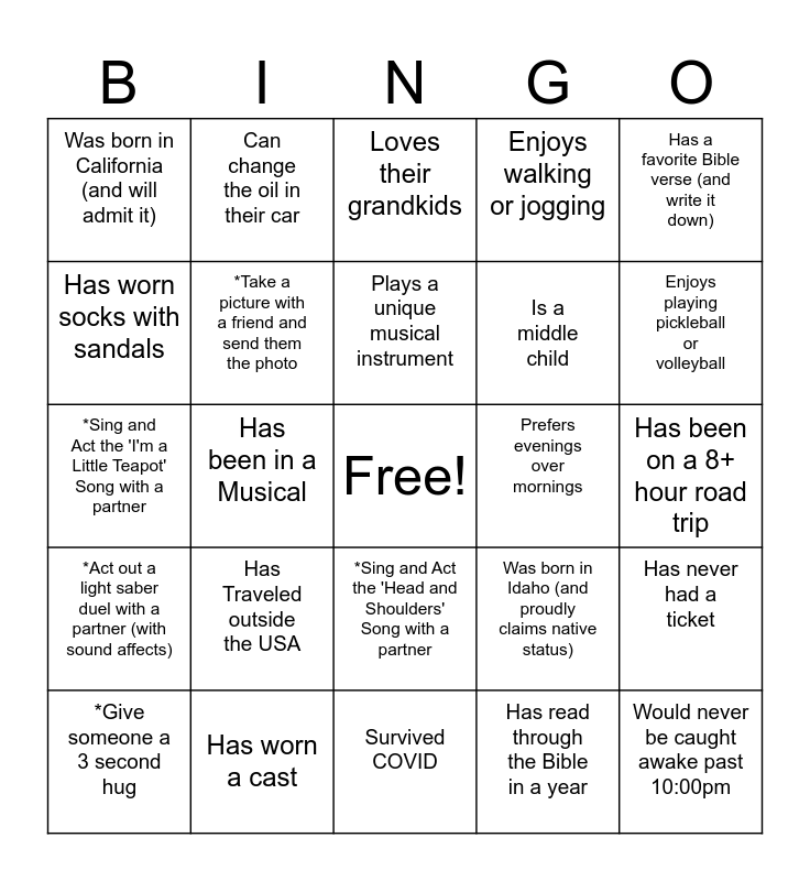 This bingo card has a free space and 24 words: Has Traveled outside the USA, Has worn a cast, Plays a unique musical instrument, *Give someone a 3 second hug, Has a favorite Bible verse (and write it down), Was born in California (and will admit it), Has worn socks with sandals, Can change the oil in their car, Prefers evenings over mornings, *Sing and Act the 'Head and Shoulders' Song with a partner, Is a middle child, *Sing and Act the 'I'm a Little Teapot' Song with a partner, Was born in Idaho (and proudly claims native status), Has never had a ticket, *Take a picture with a friend and send them the photo, Has read through the Bible in a year, Has been on a 8+ hour road trip, Loves their grandkids, Enjoys playing pickleball or volleyball, Has been in a Musical, Would never be caught awake past 10:00pm, *Act out a light saber duel with a partner (with sound affects), Enjoys walking or jogging and Survived COVID.