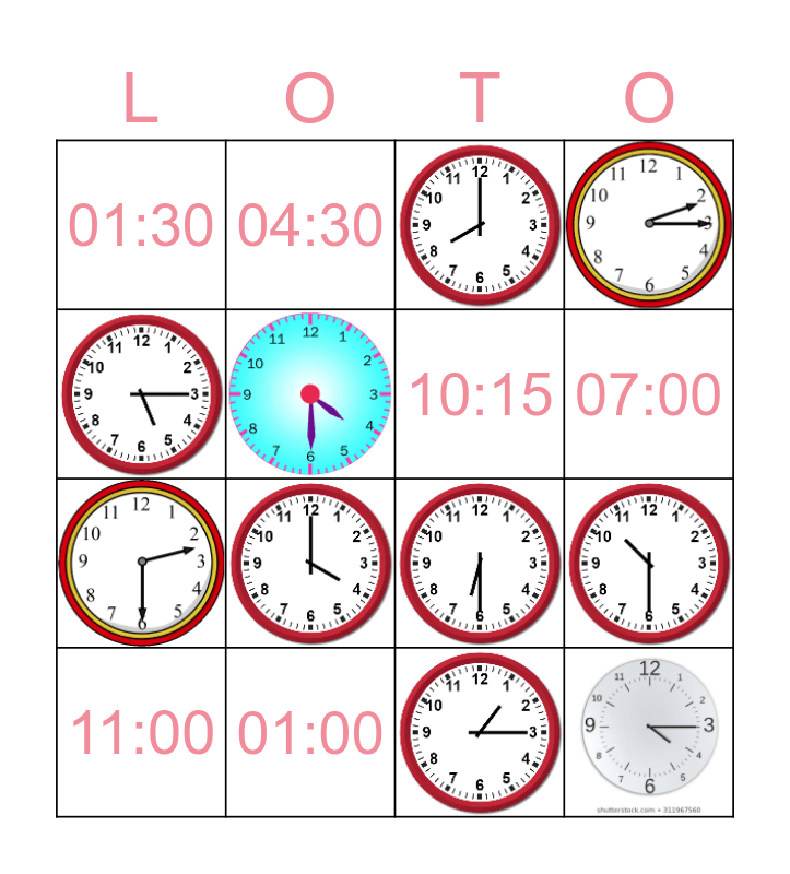 This bingo card has 18 images and 15 words: 03:15, 09:30, 10:15, 06:30, 04:30, 07:00, 08:45, 01:00, 12:30, 03:15, 11:15, 08:30, 01:30, 12:15 and 11:00.