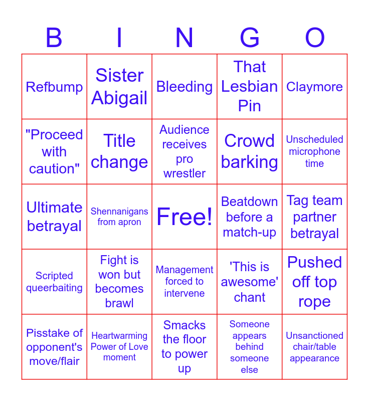 This bingo card has a free space and 31 words: Smacks the floor to power up, 'somehow'..., Shennanigans from apron, 'wrecking our announce desk', Refbump, Bleeding, Title change, 'This is awesome' chant, Beatdown before a match-up, Someone appears behind someone else, Tag team partner betrayal, Unsanctioned chair/table appearance, Shock MITB claim, Kid yeets out of time, Unscheduled microphone time, Argument about countout, Pushed off top rope, Fight is won but becomes brawl, Scripted queerbaiting, Management forced to intervene, Claymore, RKO, Pisstake of opponent's move/flair, Sister Abigail, Crowd barking, "Proceed with caution", That Lesbian Pin, Ultimate betrayal, Heartwarming Power of Love moment, Audience receives pro wrestler and Chase round the ring.