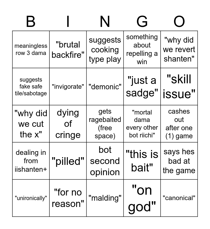 This bingo card has a free space and 24 words: "pilled", "for no reason", "demonic", "unironically", "why did we revert shanten", meaningless row 3 dama, suggests fake safe tile/sabotage, "brutal backfire", "mortal dama every other bot riichi", bot second opinion, "just a sadge", "why did we cut the x", "this is bait", says hes bad at the game, "invigorate", "on god", cashes out after one (1) game, suggests cooking type play, "skill issue", dying of cringe, "canonical", dealing in from iishanten+, something about repelling a win and "malding".