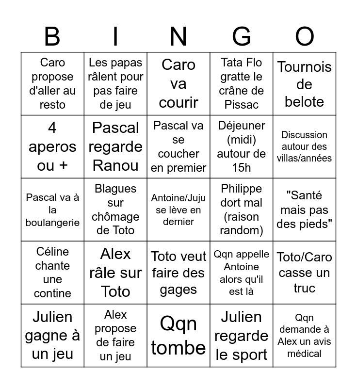 This bingo card has a free space and 24 words: Alex râle sur Toto, Alex propose de faire un jeu, Pascal va se coucher en premier, Julien gagne à un jeu, Tournois de belote, Caro propose d'aller au resto, 4 aperos ou +, Les papas râlent pour pas faire de jeu, Philippe dort mal (raison random), Toto veut faire des gages, Déjeuner (midi) autour de 15h, Pascal va à la boulangerie, Qqn appelle Antoine alors qu'il est là, Toto/Caro casse un truc, Pascal regarde Ranou, Julien regarde le sport, "Santé mais pas des pieds", Caro va courir, Discussion autour des villas/années, Blagues sur chômage de Toto, Qqn demande à Alex un avis médical, Céline chante une contine, Tata Flo gratte le crâne de Pissac and Qqn tombe.