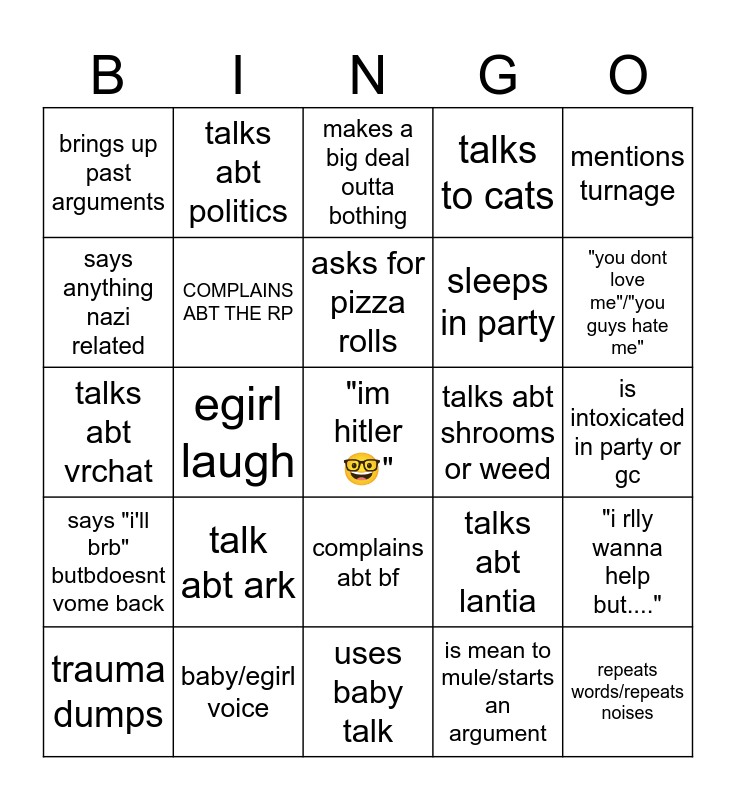 This bingo card has a free space and 24 words: talk abt ark, baby/egirl voice, asks for pizza rolls, trauma dumps, mentions turnage, brings up past arguments, says anything nazi related, talks abt politics, talks abt shrooms or weed, complains abt bf, sleeps in party, talks abt vrchat, talks abt lantia, "i rlly wanna help but....", COMPLAINS ABT THE RP, is mean to mule/starts an argument, is intoxicated in party or gc, makes a big deal outta bothing, "you dont love me"/"you guys hate me", egirl laugh, repeats words/repeats noises, says "i'll brb" butbdoesnt vome back, talks to cats and uses baby talk.