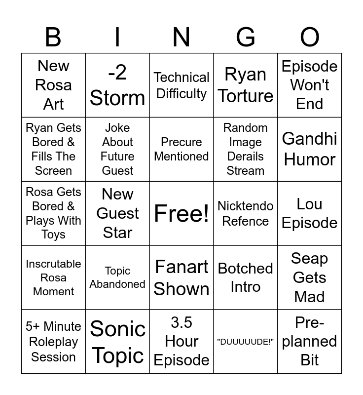 This bingo card has a free space and 24 words: Topic Abandoned, Sonic Topic, Precure Mentioned, 5+ Minute Roleplay Session, Episode Won't End, New Rosa Art, Ryan Gets Bored & Fills The Screen, -2 Storm, Nicktendo Refence, Fanart Shown, Random Image Derails Stream, Rosa Gets Bored & Plays With Toys, Botched Intro, Seap Gets Mad, Joke About Future Guest, "DUUUUUDE!", Lou Episode, Technical Difficulty, Gandhi Humor, New Guest Star, Pre-planned Bit, Inscrutable Rosa Moment, Ryan Torture and 3.5 Hour Episode.