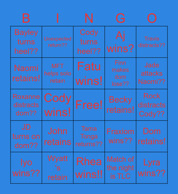 This bingo card has a free space and 24 words: John retains, Wyatt ‘s retain, Fatu wins!, Iyo wins??, Travis distracts??, Bayley turns heel??, Naomi retains!, Unexpected return??, Becky retains!, Tama Tonga returns??, Finn makes dom lose??, Roxanne distracts dom??, Fraxiom wins??, Dom retains!, MFT helps solo retain, Match of the night is TLC, Rock distracts Cody??, Cody turns heel??, Jade attacks Naomi??, Cody wins!, Lyra wins??, JD turns on dom??, Aj wins? and Rhea wins!!.