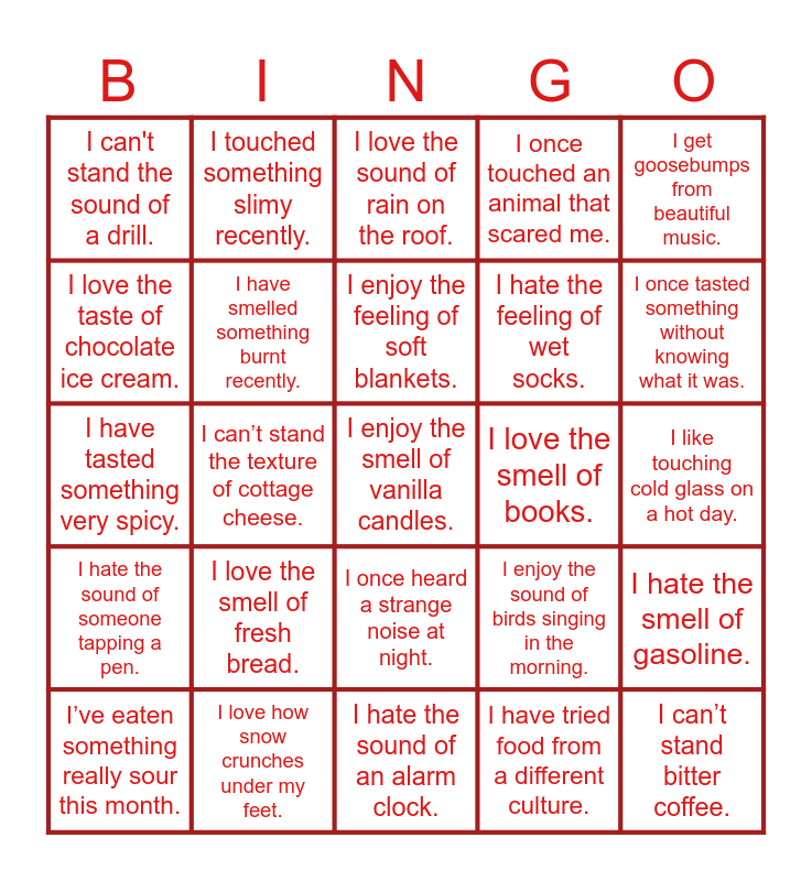 This bingo card has 25 words: I love the smell of fresh bread., I hate the sound of an alarm clock., I enjoy the feeling of soft blankets., I’ve eaten something really sour this month., I get goosebumps from beautiful music., I can't stand the sound of a drill., I love the taste of chocolate ice cream., I touched something slimy recently., I love the smell of books., I once heard a strange noise at night., I hate the feeling of wet socks., I have tasted something very spicy., I enjoy the sound of birds singing in the morning., I hate the smell of gasoline., I have smelled something burnt recently., I can’t stand bitter coffee., I like touching cold glass on a hot day., I love the sound of rain on the roof., I once tasted something without knowing what it was., I can’t stand the texture of cottage cheese., I enjoy the smell of vanilla candles., I love how snow crunches under my feet., I hate the sound of someone tapping a pen., I once touched an animal that scared me. and I have tried food from a different culture..