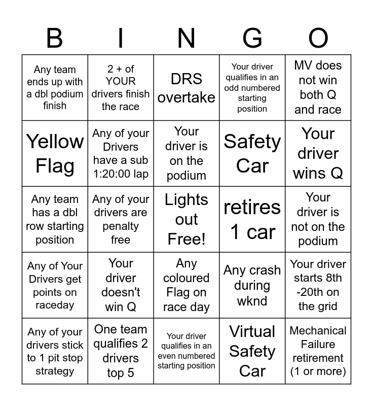 This bingo card has a free space and 28 words: Your driver starts 8th -20th on the grid, Any non car racing "celebrity" is spotted in the paddock, Safety Car, Virtual Safety Car, Yellow Flag, DRS overtake, 2 + of YOUR drivers finish the race, Any of Your Drivers get points on raceday, retires 1 car, Any of your drivers stick to 1 pit stop strategy, Any team has a dbl row starting position, Your driver qualifies in an odd numbered starting position, One team qualifies 2 drivers top 5, Your driver qualifies in an even numbered starting position, Your driver wins Q, Any of your drivers finish P11 - P20 raceday, Your driver doesn't win Q, Any of your Drivers have a sub 1:20:00 lap, Your driver is on the podium, Any coloured Flag on race day, Any team ends up with a dbl podium finish, Any of your drivers don't win Fastest Lap, Mechanical Failure retirement (1 or more), Any of your drivers are penalty free, Your driver is not on the podium, Any crash during wknd, MV does not win both Q and race and Any of your your drivers qualify better than LH, LN or FA.