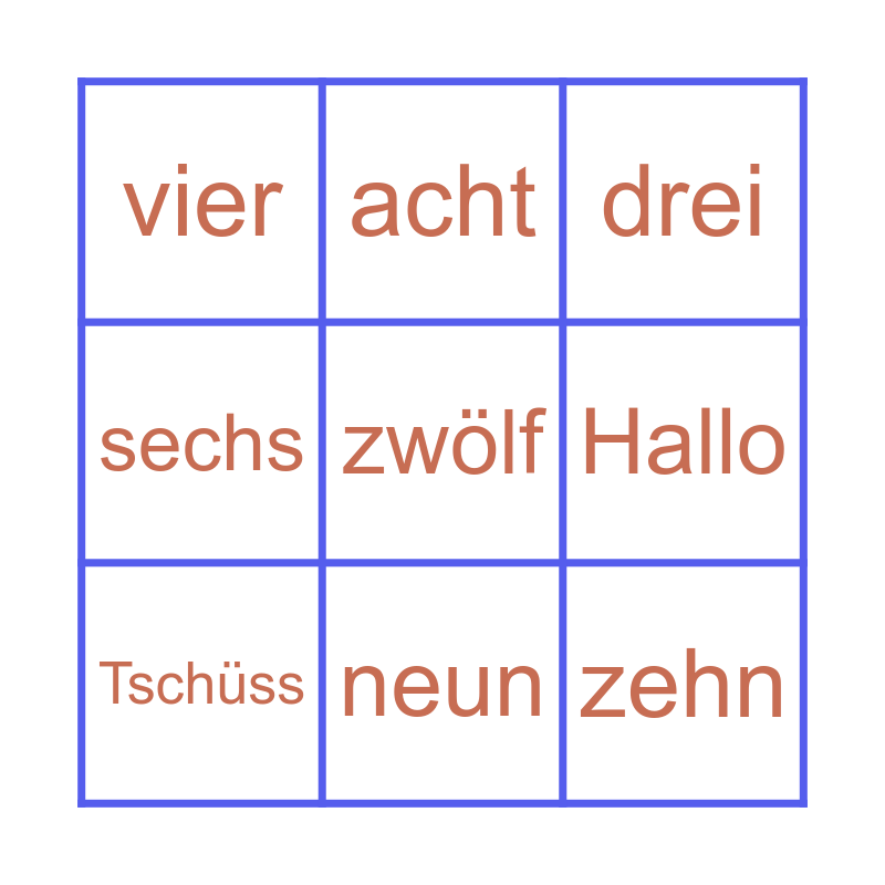 This bingo card has 18 words: eins, zwei, drei, vier, fünf, sechs, sieben, acht, neun, zehn, elf, zwölf, Guten Morgen, Hallo, Tschüss, Guten Tag, Guten Abend and Gute Nacht.