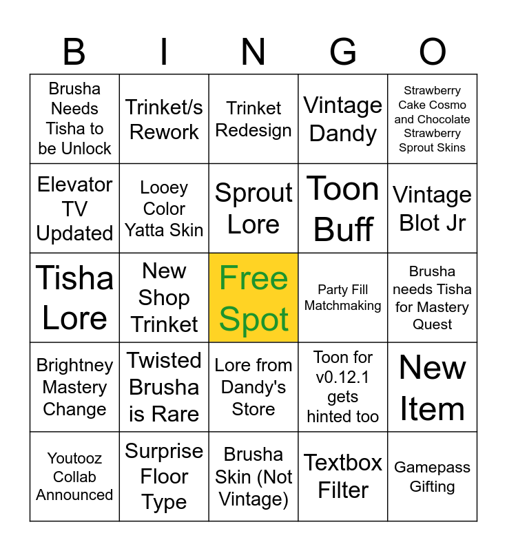 This bingo card has a free space and 24 words: Twisted Brusha is Rare, Surprise Floor Type, Sprout Lore, Youtooz Collab Announced, Strawberry Cake Cosmo and Chocolate Strawberry Sprout Skins, Brusha Needs Tisha to be Unlock, Elevator TV Updated, Trinket/s Rework, Party Fill Matchmaking, Lore from Dandy's Store, Toon Buff, Tisha Lore, Toon for v0.12.1 gets hinted too, New Item, Looey Color Yatta Skin, Textbox Filter, Brusha needs Tisha for Mastery Quest, Trinket Redesign, Vintage Blot Jr, New Shop Trinket, Gamepass Gifting, Brightney Mastery Change, Vintage Dandy and Brusha Skin (Not Vintage).