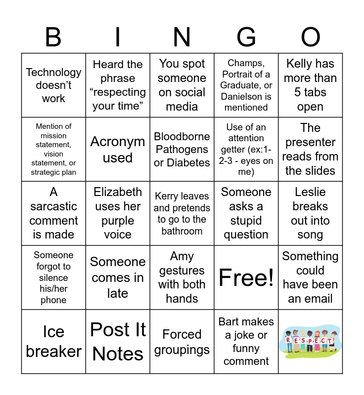 This bingo card has 1 images and 26 words: Free!, Use of an attention getter (ex:1-2-3 - eyes on me), Forced groupings, Mention of mission statement, vision statement, or strategic plan, You spot someone on social media, Heard the phrase “respecting your time”, Someone forgot to silence his/her phone, Someone asks a stupid question, Something could have been an email, A sarcastic comment is made, Champs, Portrait of a Graduate, or Danielson is mentioned, Ice breaker, Post It Notes, The presenter reads from the slides, Gallery walk, Acronym used, Bloodborne Pathogens or Diabetes, Someone comes in late, Technology doesn’t work, Leslie breaks out into song, Bart makes a joke or funny comment, Elizabeth uses her purple voice, Kerry leaves and pretends to go to the bathroom, Amy gestures with both hands, Kelly has more than 5 tabs open and Kristen updates her To-Do List.