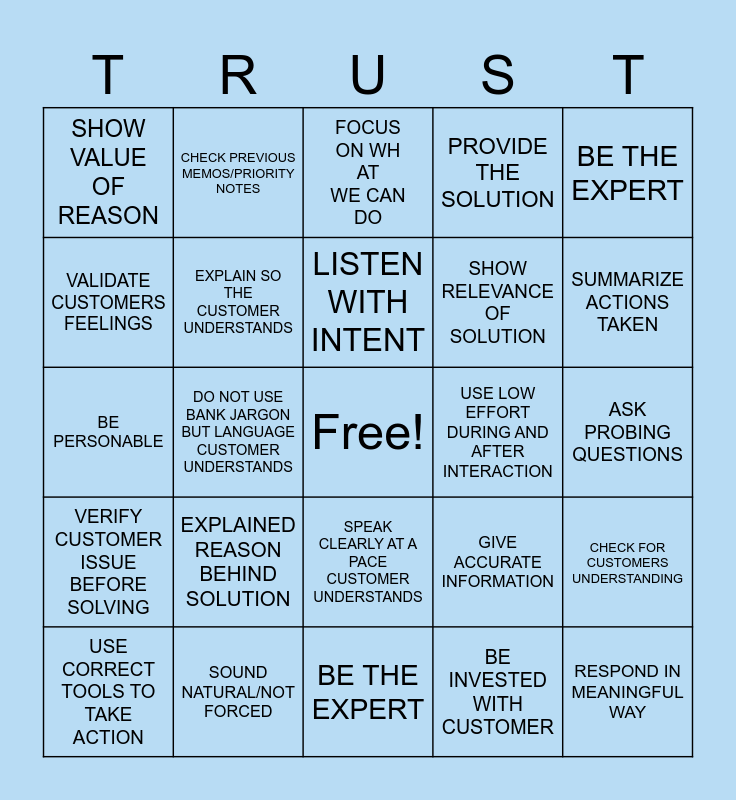 This bingo card has a free space and 24 words: EXPLAINED REASON BEHIND SOLUTION, SOUND NATURAL/NOT FORCED, LISTEN WITH INTENT, USE CORRECT TOOLS TO TAKE ACTION, BE THE EXPERT, SHOW VALUE OF REASON, VALIDATE CUSTOMERS FEELINGS, CHECK PREVIOUS MEMOS/PRIORITY NOTES, USE LOW EFFORT DURING AND AFTER INTERACTION, SPEAK CLEARLY AT A PACE CUSTOMER UNDERSTANDS, SHOW RELEVANCE OF SOLUTION, BE PERSONABLE, GIVE ACCURATE INFORMATION, CHECK FOR CUSTOMERS UNDERSTANDING, EXPLAIN SO THE CUSTOMER UNDERSTANDS, BE INVESTED WITH CUSTOMER, ASK PROBING QUESTIONS, FOCUS ON WHAT WE CAN DO, SUMMARIZE ACTIONS TAKEN, DO NOT USE BANK JARGON BUT LANGUAGE CUSTOMER UNDERSTANDS, RESPOND IN MEANINGFUL WAY, VERIFY CUSTOMER ISSUE BEFORE SOLVING, PROVIDE THE SOLUTION and BE THE EXPERT.