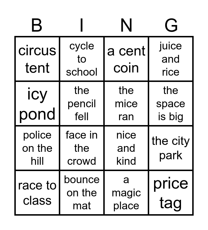 This bingo card has 20 words: the city park, a nice face, a cent coin, lace on the bag, race to class, icy pond, bounce on the mat, circus tent, police on the hill, cycle to school, face in the crowd, nice and kind, the pencil fell, price tag, the mice ran, practice the song, the space is big, juice and rice, a magic place and trace the path.